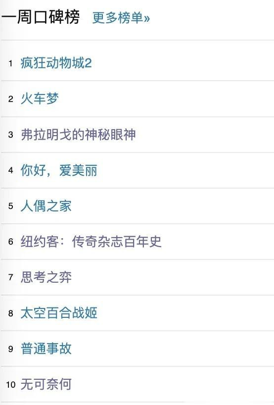 最后,还是例行附上一周豆瓣口碑榜的完整榜单: