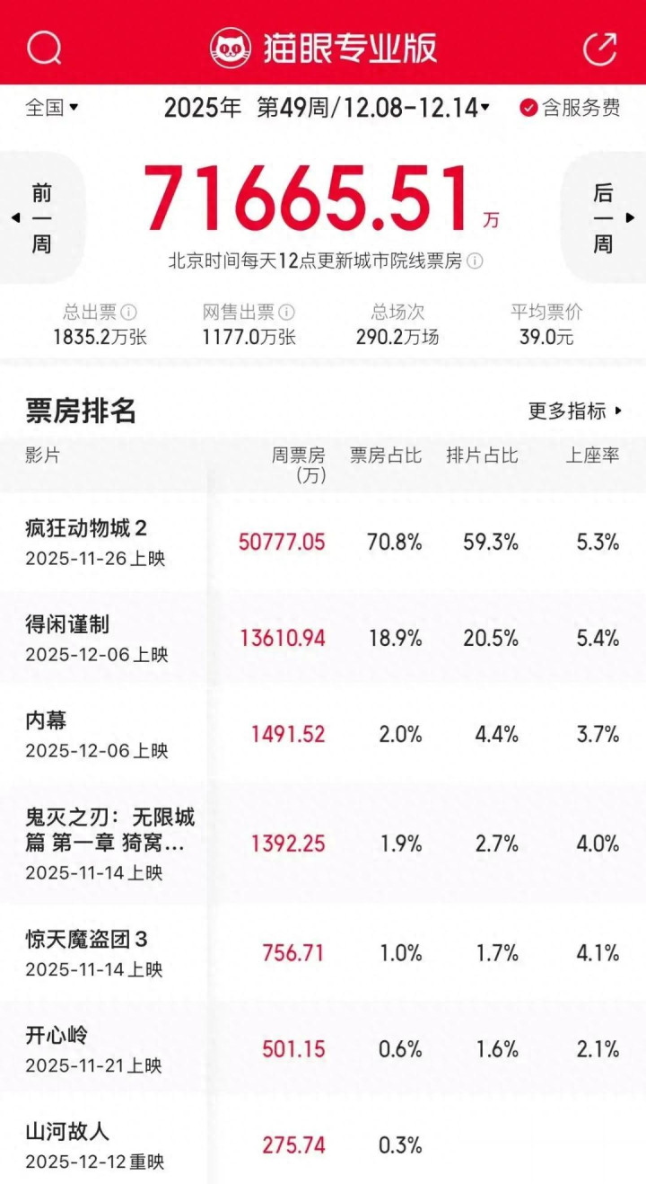 上一周的院线片其实稍微是有些不温不火的,最热门的院线片仍然是《疯狂动物城2》,本片上周票房为5.07亿,累计票房已经达到了35亿,即将成为2025年年度票房榜第二名了。